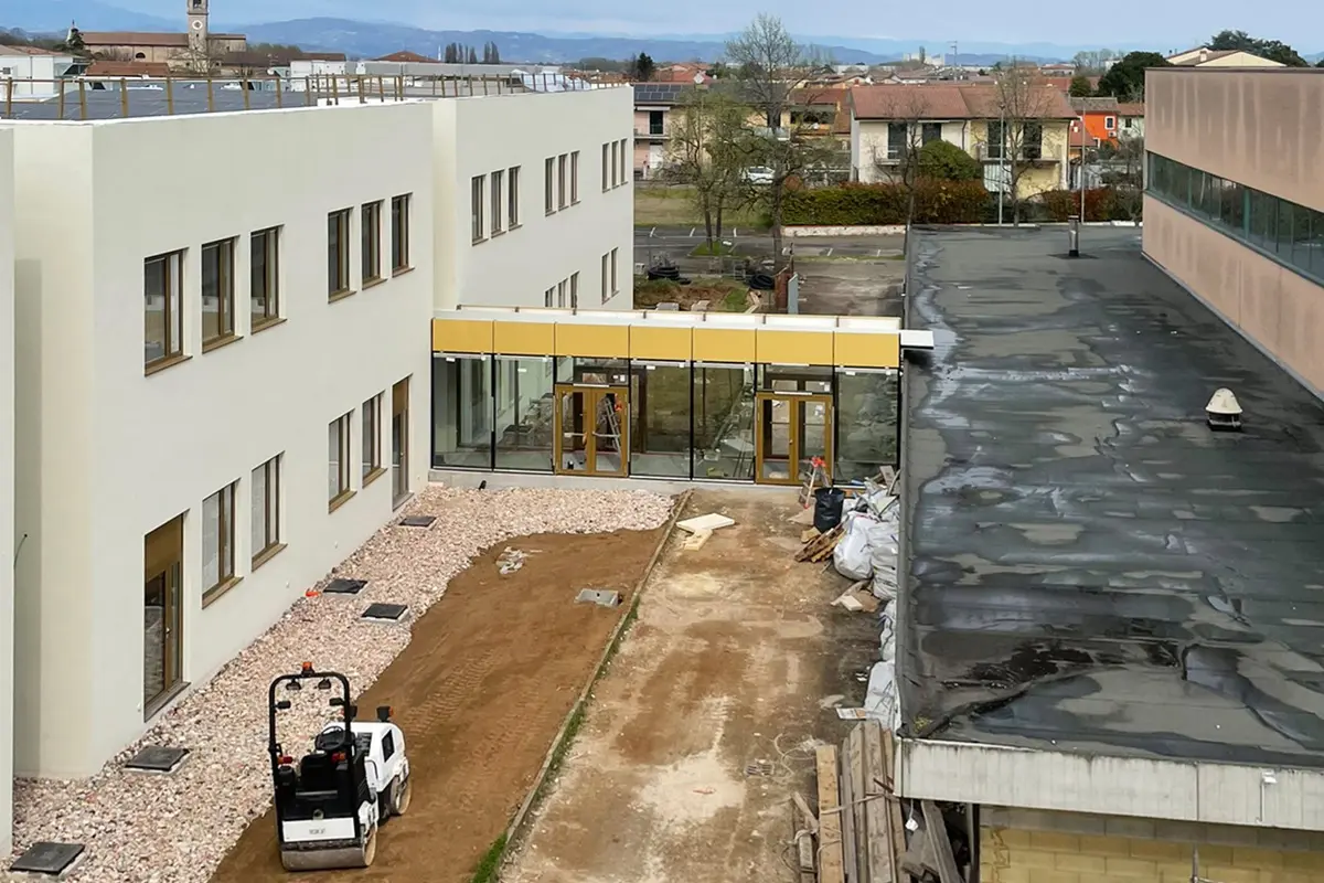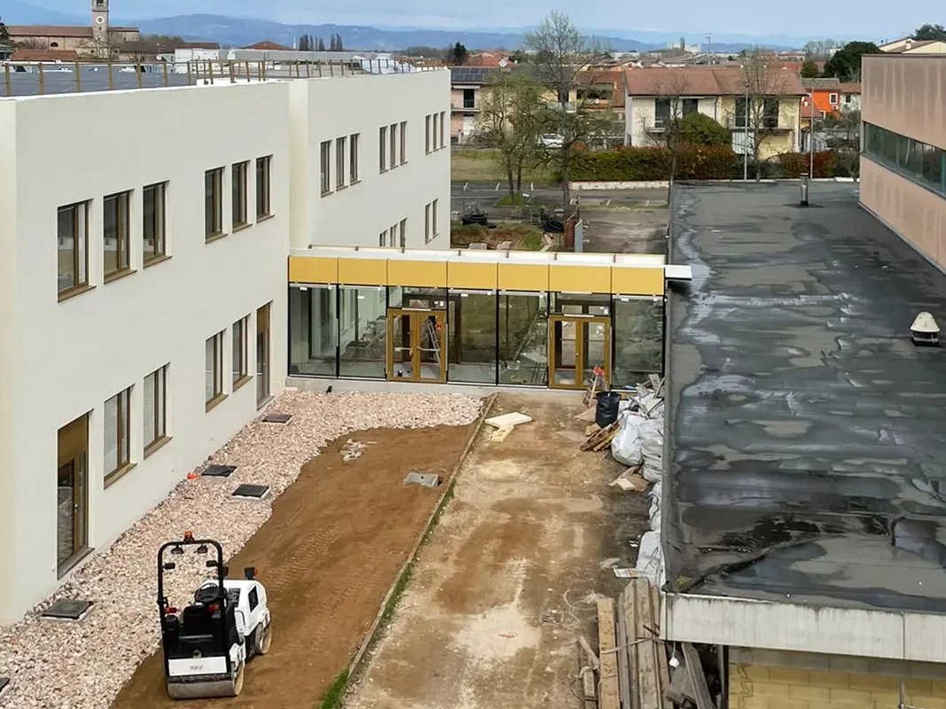 Lo stato attuale del cantiere per il nuovo polo scolastico di Albaredo d’Adige evidenzia un progetto che volge al termine, con gli interni pressoché completi e l’attenzione spostata sulle finiture di dettaglio e le sistemazioni esterne, pronto ad accogliere le generazioni di domani.