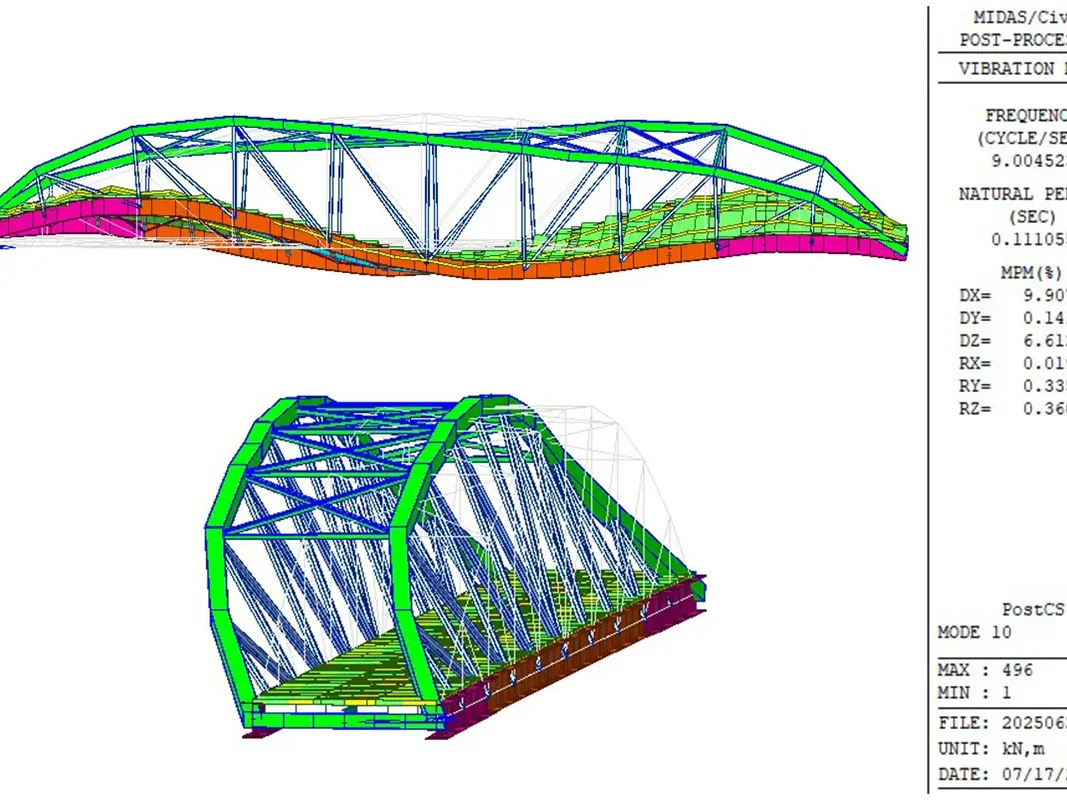 - Types of FEM analysis: 3D mesh, modal analysis to evaluate characteristic frequencies, non-linear analysis for large displacements or instability phenomena. In the presence of significant spans, concentrated masses or activities that can generate vibrations (e.g. rail traffic), modal analysis is essential.