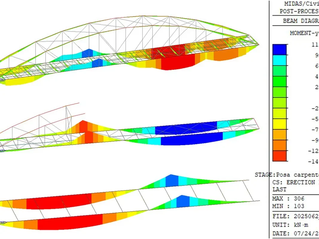The feasibility study evaluates typological solutions (beam, arch, cable-stayed, suspended), preliminary cost estimates, environmental impact, feasibility, launching methods and construction times. The preliminary design assumptions are defined – typical section, spans, number of spans, estimated dead weight – and an initial assessment of the loads is carried out in accordance with the applicable regulatory principles. Logistical constraints are assessed: space for assembly, accessibility for lifting machinery, impact on existing traffic.