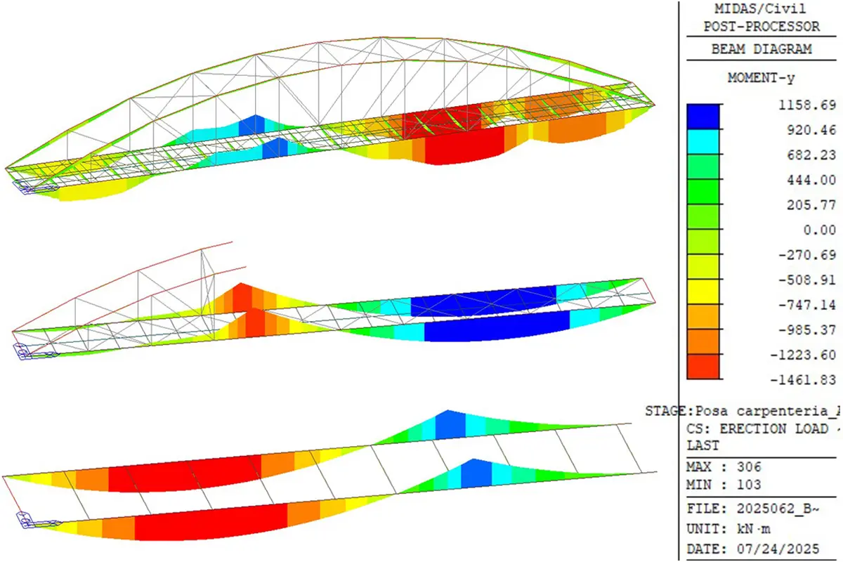 The feasibility study evaluates typological solutions (beam, arch, cable-stayed, suspended), preliminary cost estimates, environmental impact, feasibility, launching methods and construction times. The preliminary design assumptions are defined – typical section, spans, number of spans, estimated dead weight – and an initial assessment of the loads is carried out in accordance with the applicable regulatory principles. Logistical constraints are assessed: space for assembly, accessibility for lifting machinery, impact on existing traffic.