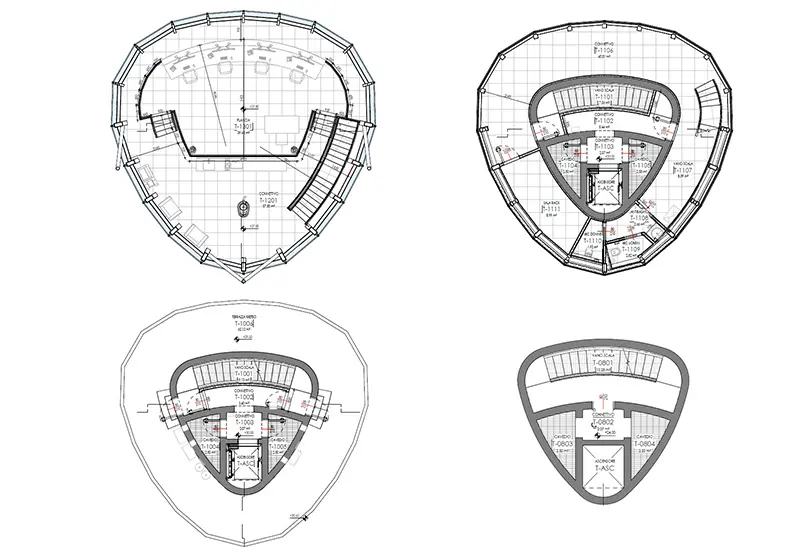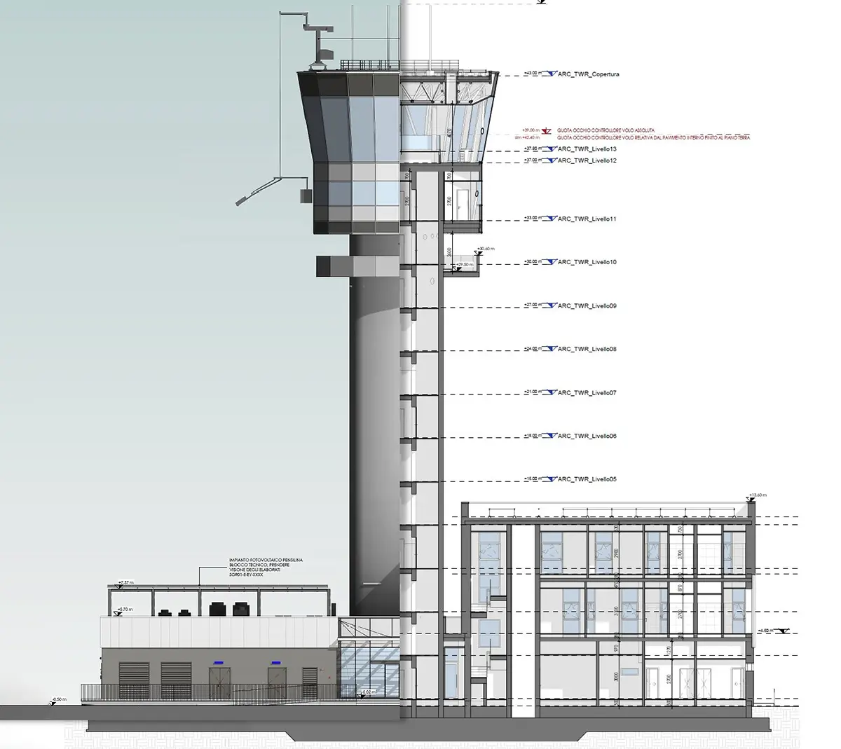 The new facility consists of the Control Tower (TWR) and the Technical Building (BT). The tower, approximately 44 metres high, hosts the Visual Control Room, designed to provide panoramic visibility and operational control of take-off, landing and ground movement operations. The Technical Building accommodates equipment rooms, technical plant areas and offices supporting the airport centre’s systems and staff.