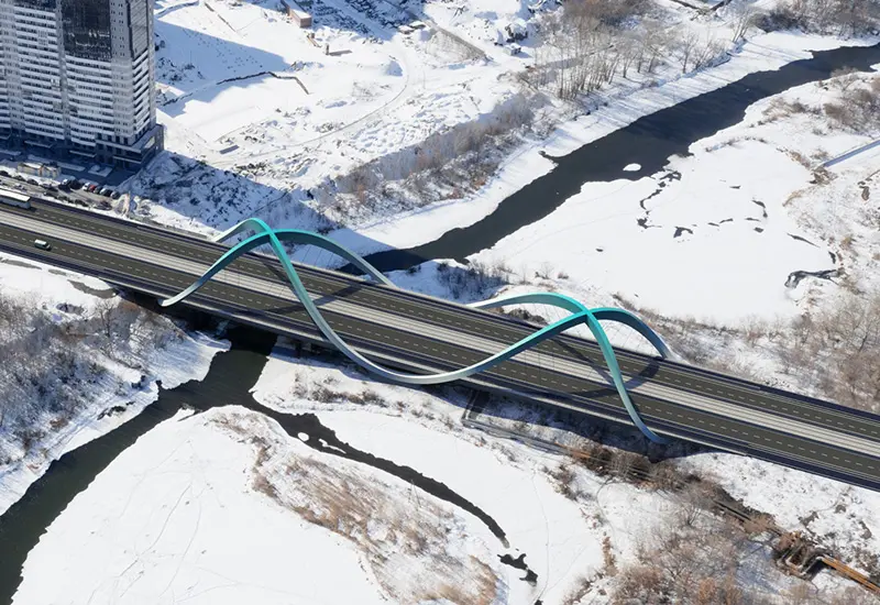 Humanity Bridge is an innovative bridge design developed by Incide Engineering for the city of Čeljabinsk, Russia. The project creates a new multimodal connection across the river, integrating four road lanes, bidirectional tram tracks, and protected pedestrian paths within a single, efficient infrastructure.
