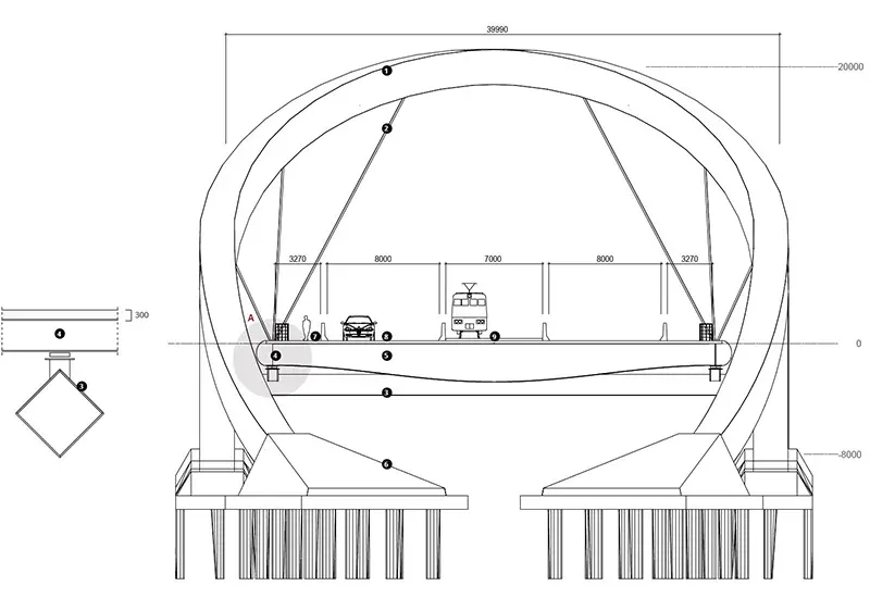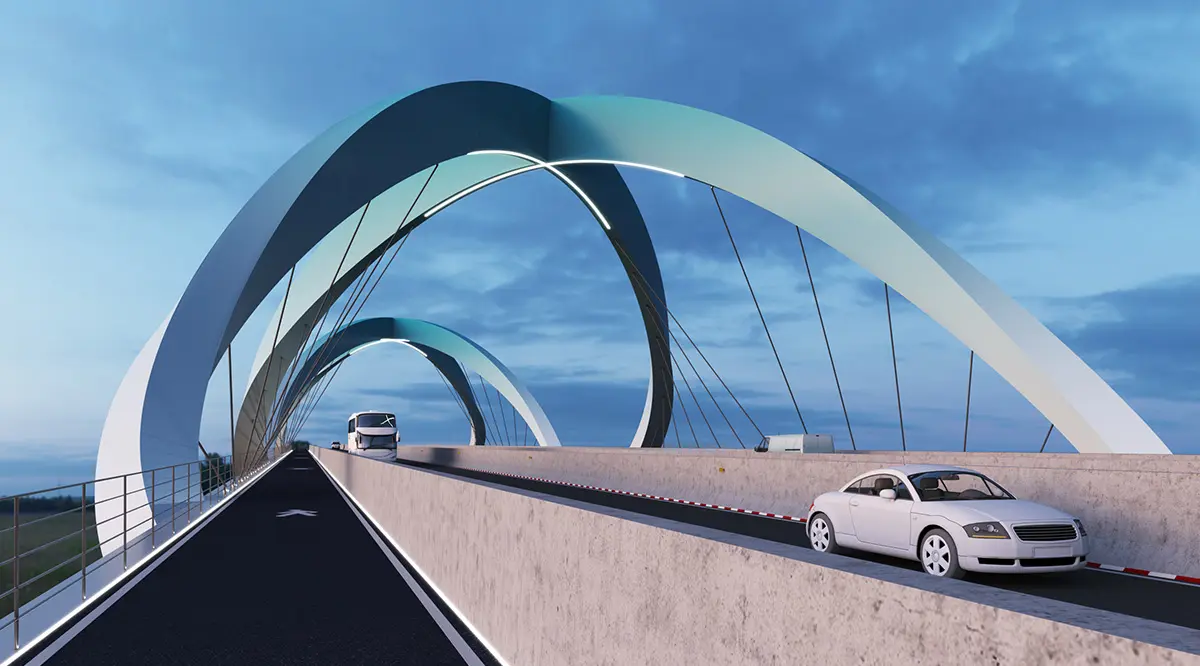 The deck structure combines steel girders and a composite concrete slab, designed to minimize construction time and improve long-term performance. Integrated lighting enhances both safety and aesthetics, turning the bridge into a recognizable urban landmark day and night.