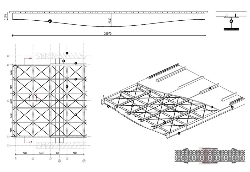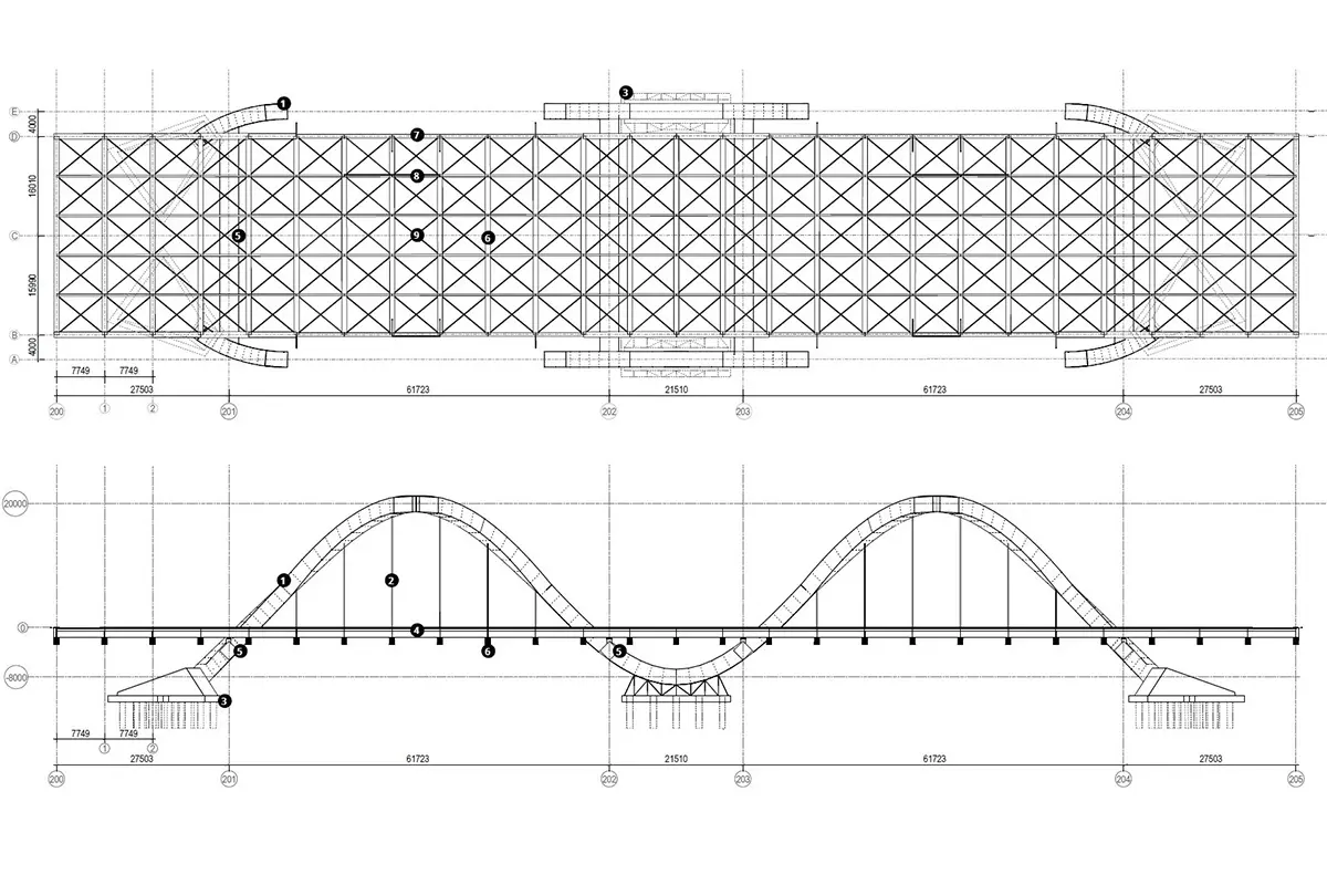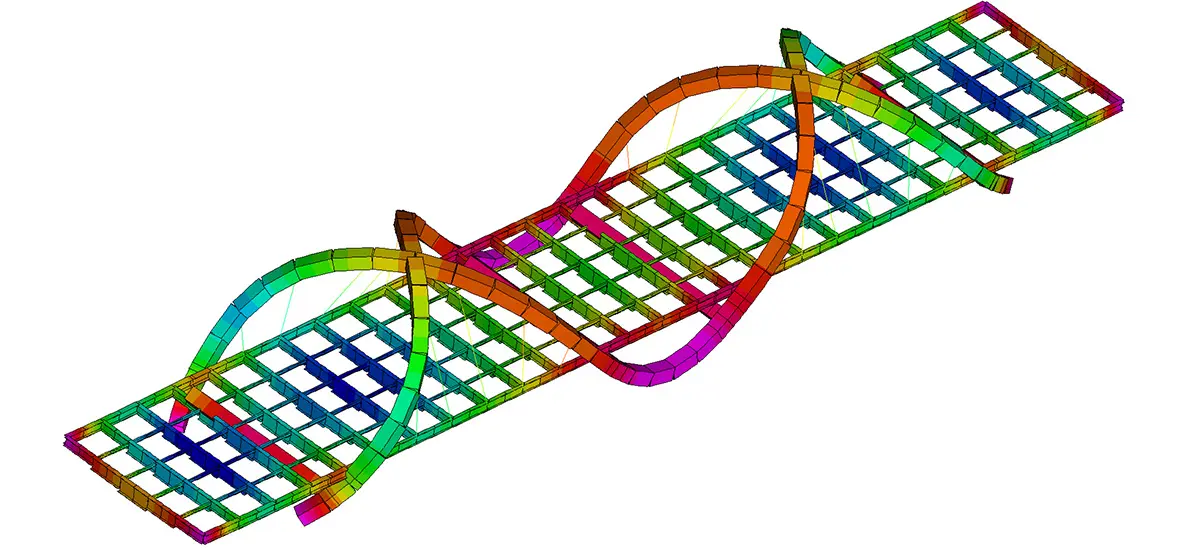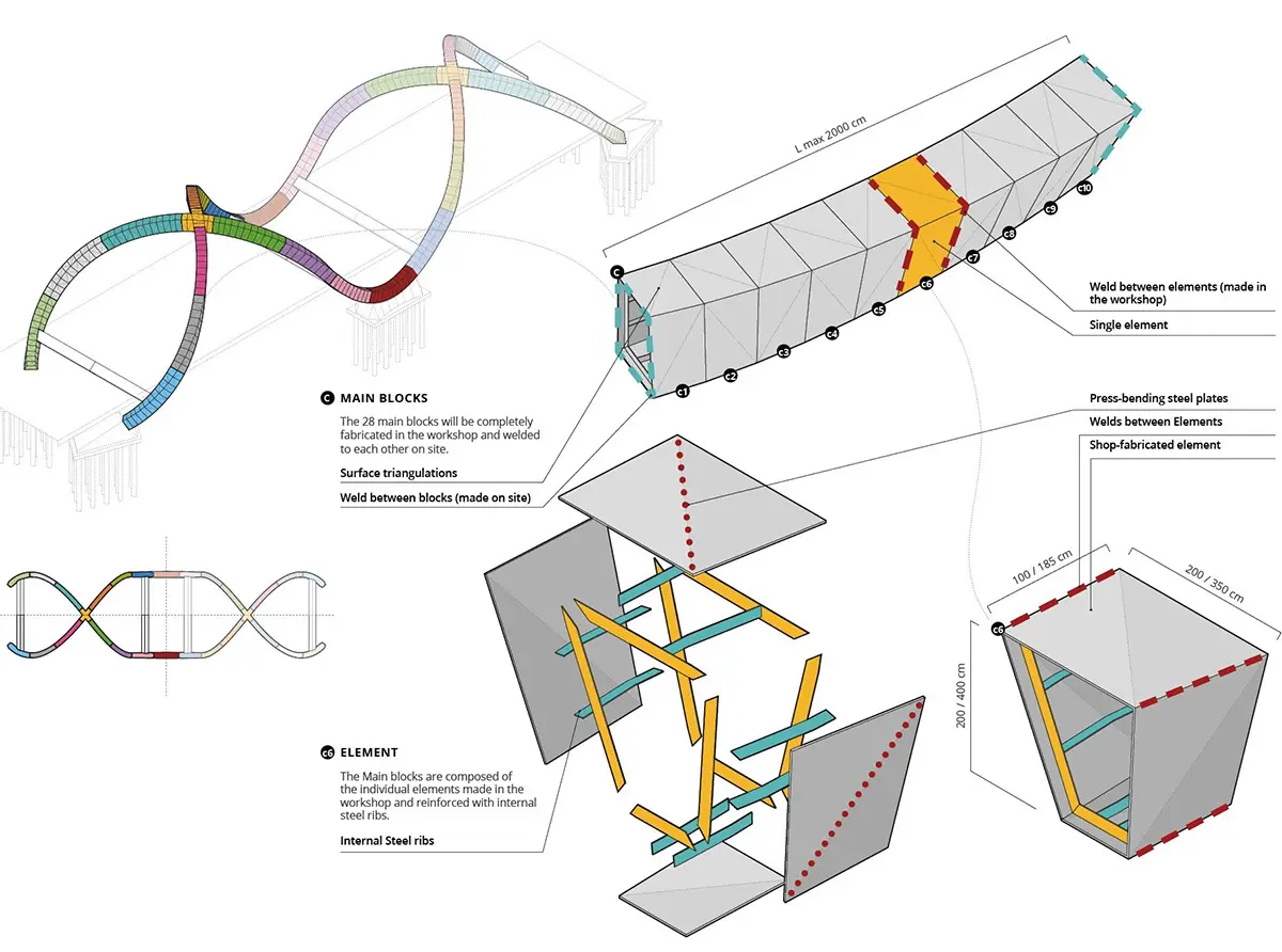 The entire concept was developed using advanced parametric modelling, enabling full control of complex geometries, structural optimization, and streamlined fabrication workflows. The signature feature of the bridge is a pair of intertwined steel arches with variable cross-sections, forming a dynamic architectural landmark visible from the surrounding urban landscape. These arches support the deck through high-strength steel strands, ensuring excellent stability and a lightweight structural expression.