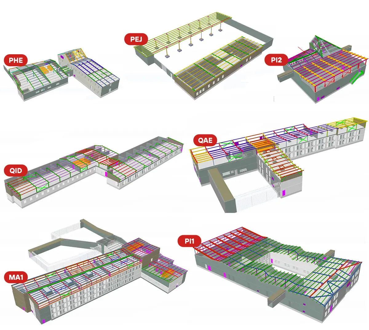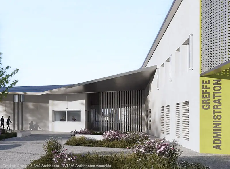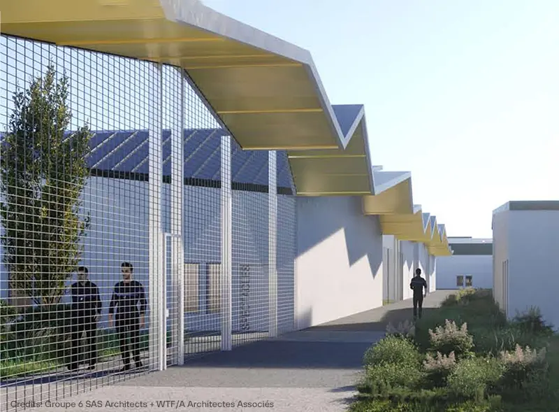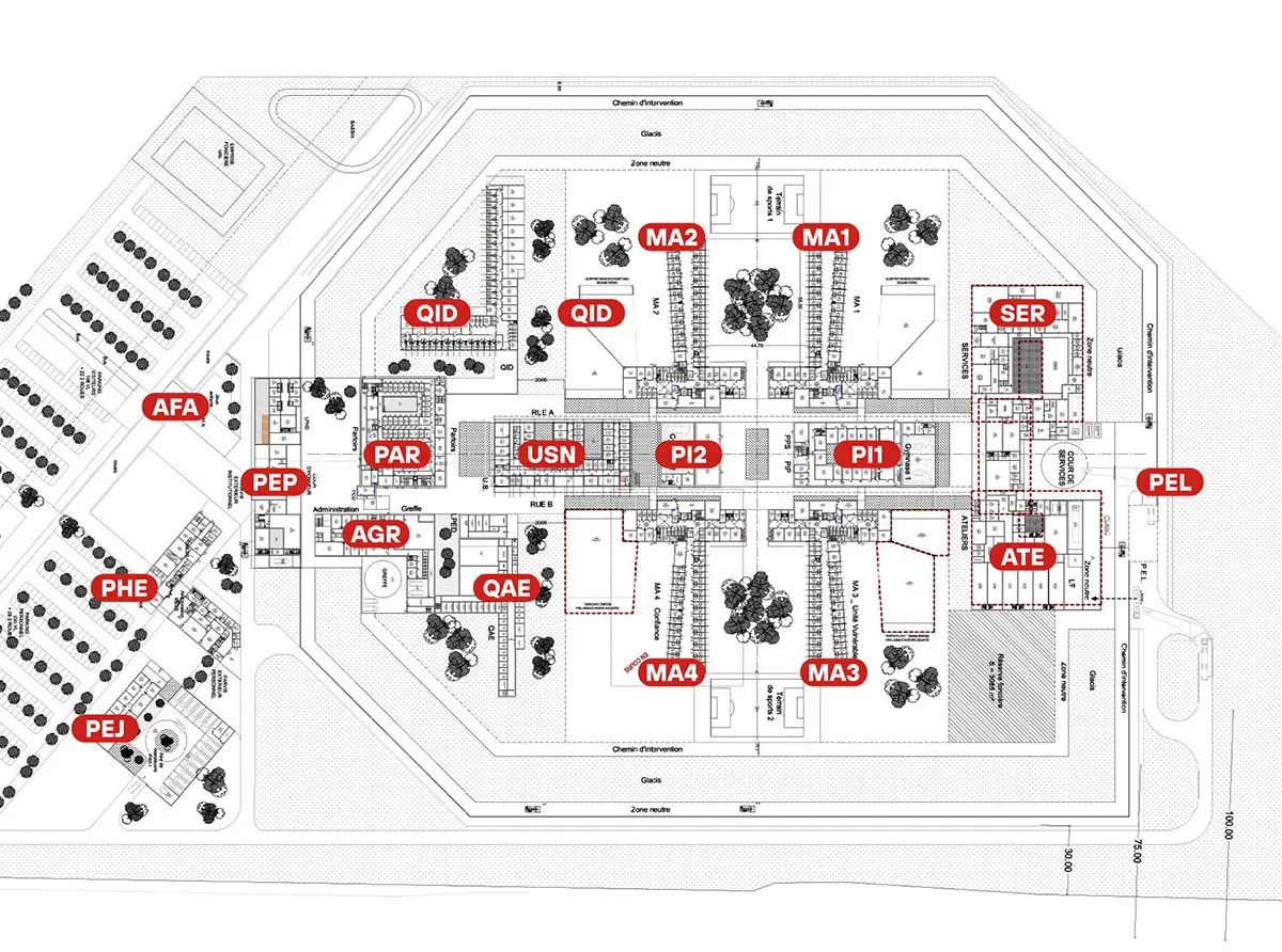 Timber roofs were designed for buildings dedicated to public reception and social services: AFA (family reception), PHE (judicial extraction centre), PIP + Gymnasium 1 (training and sports), and PI2 (education), using lightweight glulam and solid timber systems. Steel roofs were adopted for operational, technical and detention facilities such as MESS (canteen), PREJ (judicial transfers), PAR (visiting rooms, UVF), QAE, QID, SAT (healthcare), USN (medical unit), PEP (main entrance), PEL, SGC (logistics, workshops, catering, laundry) and detention blocks MA1–MA4. Building PI1 featured a hybrid steel–timber roof for optimized rigidity and reduced weight.