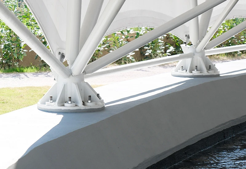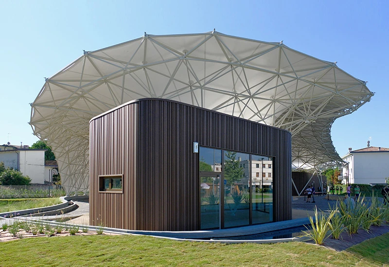 La nouvelle structure dialogue avec le parc de manière fluide, valorisant son utilisation et positionnant le théâtre de manière à faciliter la connexion entre la zone piétonne et le parc urbain. Un nouveau toit sinueux, créé au moyen d'une structure en acier recouverte d'une membrane translucide qui enveloppe la plaque multifonctionnelle (pouvant accueillir jusqu'à six cents spectateurs) et trois corps ayant les fonctions d'entrepôt et de vestiaires pour les artistes, bar et toilettes. Le tout intégré dans un espace flexible qui s’adapte à différents scénarios d’utilisation, une extension synergique du parc capable d’accueillir diverses activités.