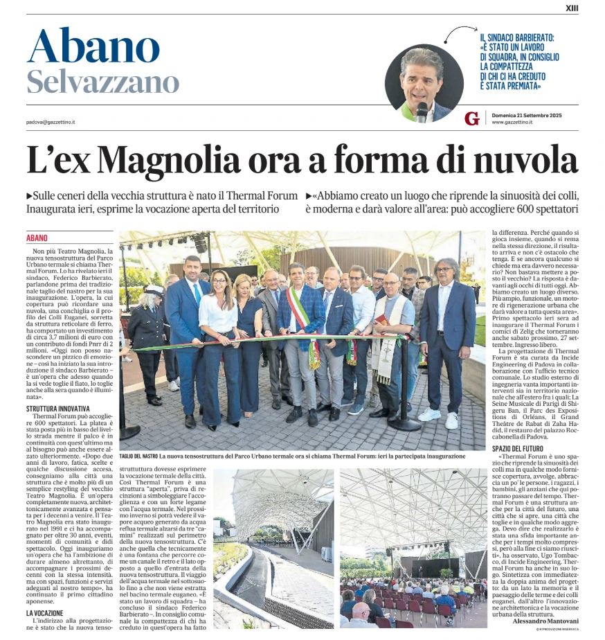 Sabato 20 settembre 2025 è stato inaugurato il Thermal Forum di Abano Terme, la nuova tensostruttura che nasce dalle ceneri dello storico Teatro Magnolia, all’interno del Parco Urbano Termale.