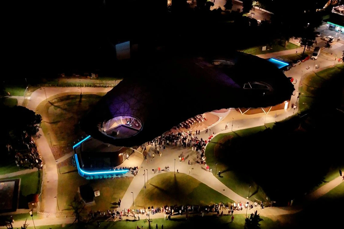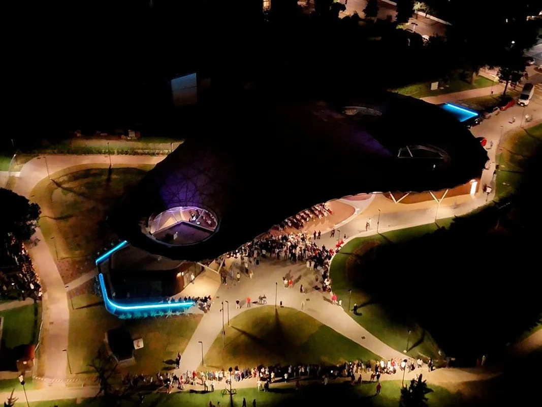 Il nuovo punto di riferimento urbano per la cultura, la socialità e l’intrattenimento presenta una copertura sinuosa, che richiama una nuvola ma anche il profilo dei Colli Euganei. Sorretta da una struttura reticolare, sa regalare inaspettate suggestioni scenografiche, soprattutto nelle ore serali con l’illuminazione notturna. La platea dialoga in modo fluido con il parco urbano, creando uno spazio flessibile e adattabile a diversi scenari d’uso. Sono stati inoltre progettati spazi dedicati a camerini, magazzini, bar e servizi, con un’integrazione attenta al paesaggio e alla sostenibilità.