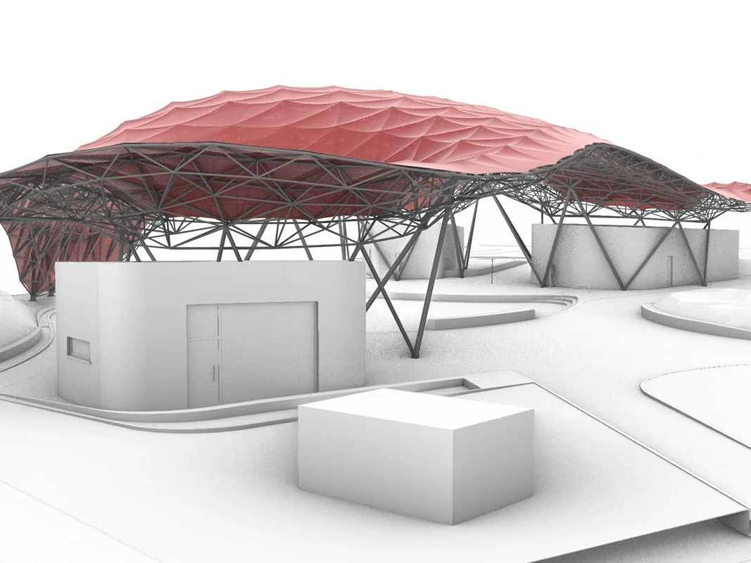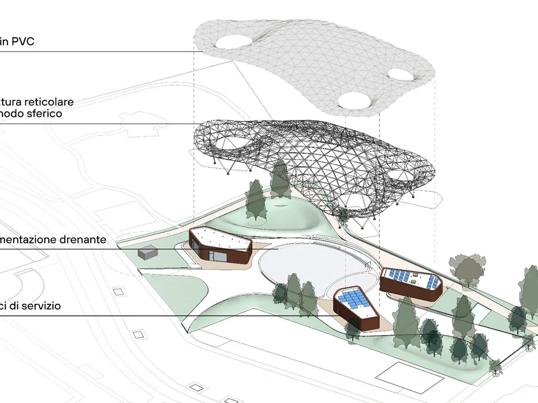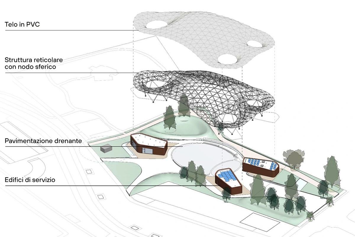 Per affrontarlo è stato adottato un approccio di parametric design, capace di trasformare la complessità geometrica in un sistema realizzabile, ottimizzato e sviluppato attraverso un processo integrato che ha coinvolto progettazione, ingegnerizzazione e produzione. Il concept architettonico è stato definito in collaborazione con il Comune di Abano Terme (PD), mentre la definizione della forma guida e della struttura reticolare è stata elaborata internamente e affinata fino a garantire la piena integrazione con i sistemi forniti da Canobbio per il telo, e da MERO per la struttura metallica.