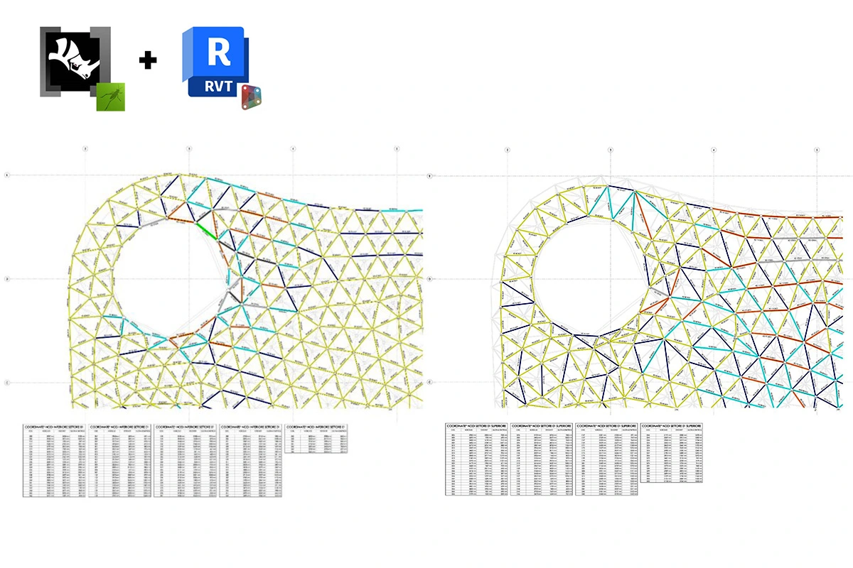 Una volta completata la modellazione, la struttura è stata esportata su Revit tramite il collegamento diretto con Rhino, così da integrare il modello parametrico nel processo BIM. Questo passaggio ha reso possibile la gestione coordinata di tutte le discipline e la produzione della documentazione esecutiva.