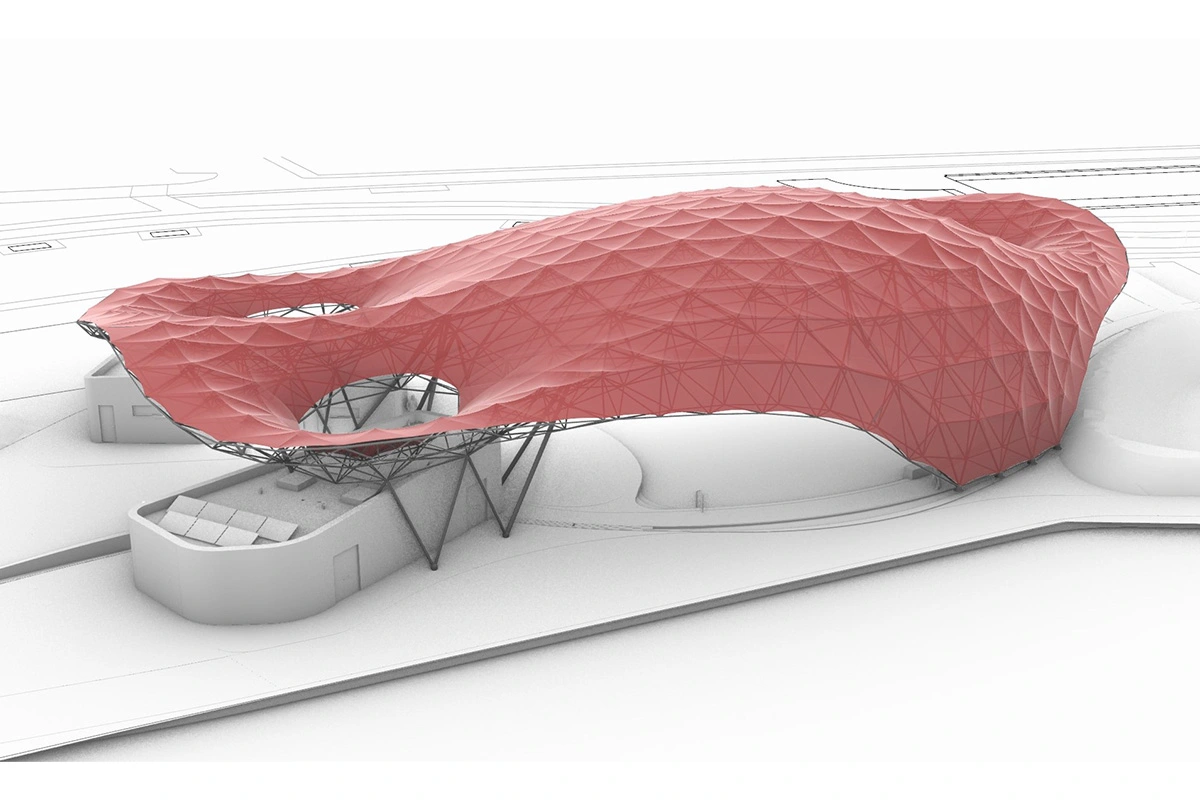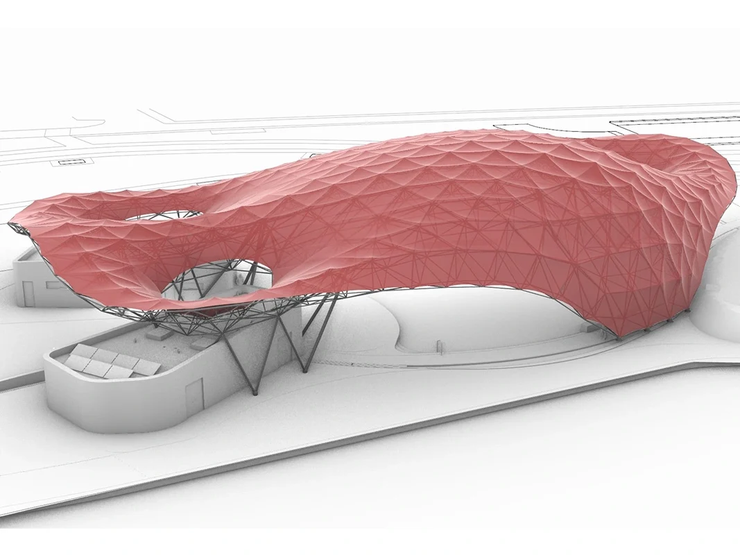 La sfida progettuale si è concentrata sulla definizione di una struttura reticolare spaziale a maglie triangolari, guidata da una superficie tridimensionale dalla forma irregolare e con discontinuità.